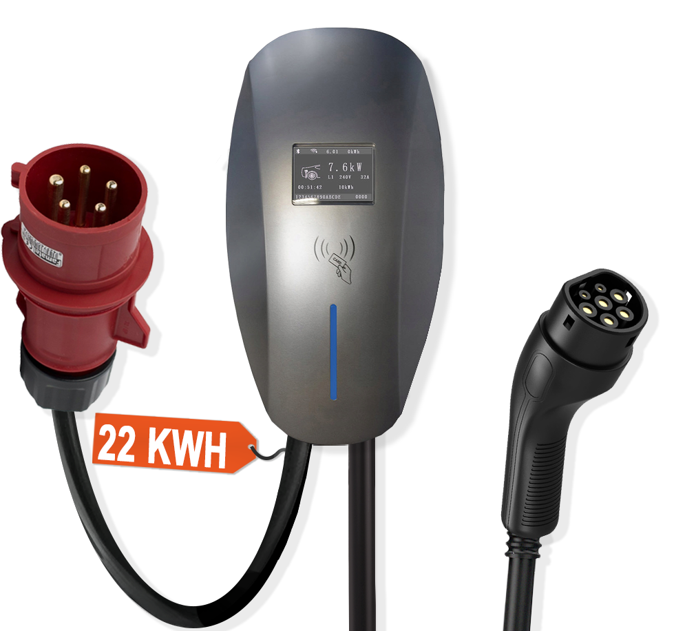 The kit includes: EV 22kwh charger with 5m cable, cable holder, 2 RFID cards, wall mount with required studs, instructions.