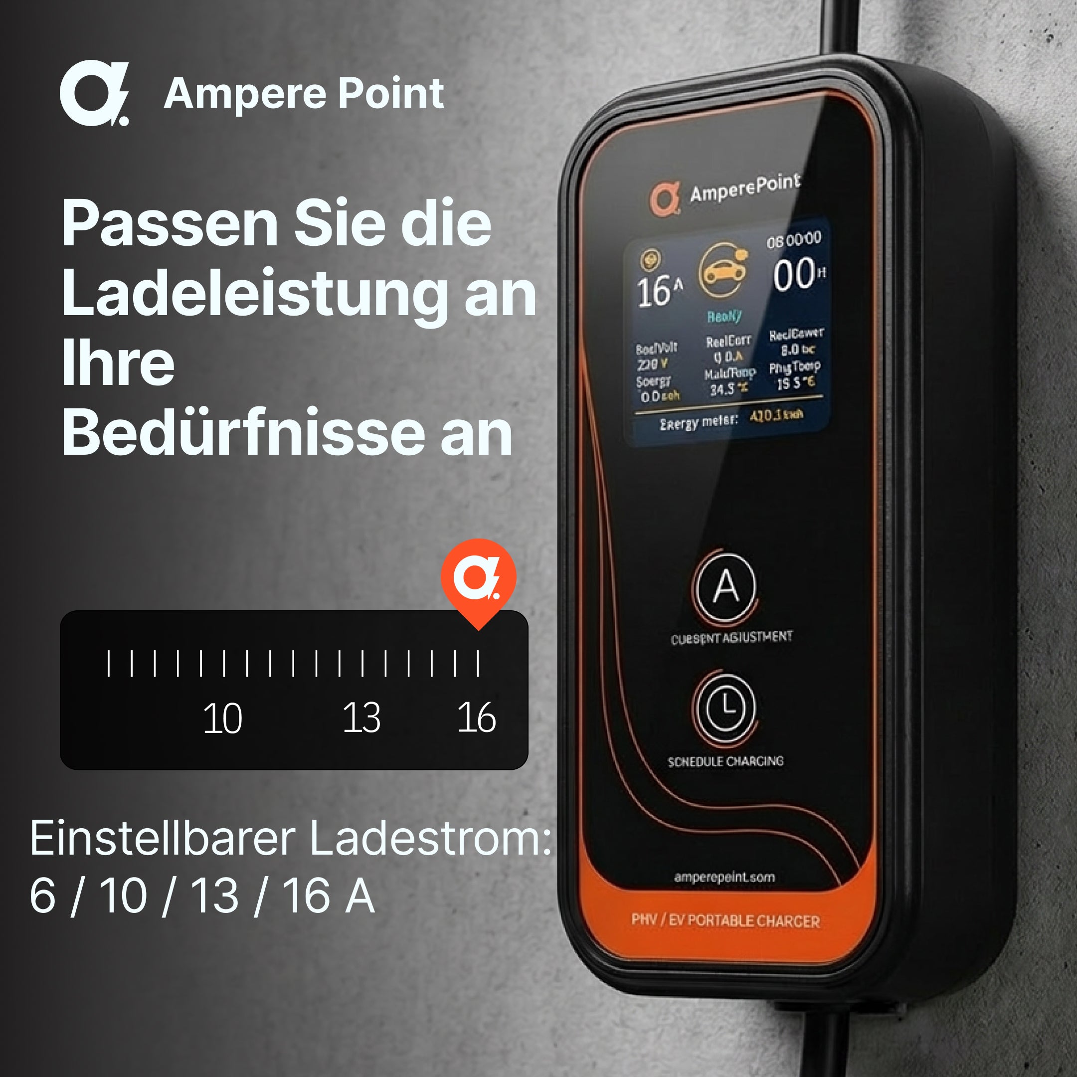 Einstellbare Ladeleistung (A: 8/10/13/16) und eine Zeitplanoption zur Optimierung des Energieverbrauchs während der Nebenzeiten.