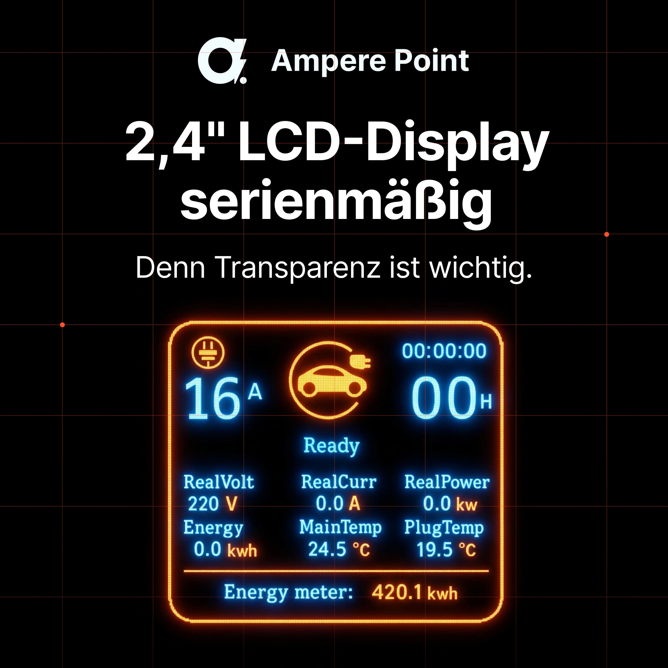 Ausgestattet mit einem 2,4"-Bildschirm, der den aktuellen Ladezustand, den Energieverbrauch und die Leistungsparameter anzeigt. So können Sie den Ladevorgang mit Zuversicht überwachen und sicherstellen, dass alles reibungslos läuft.