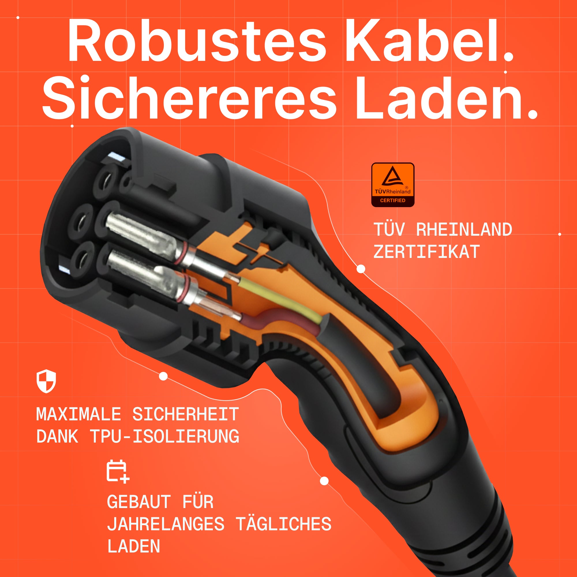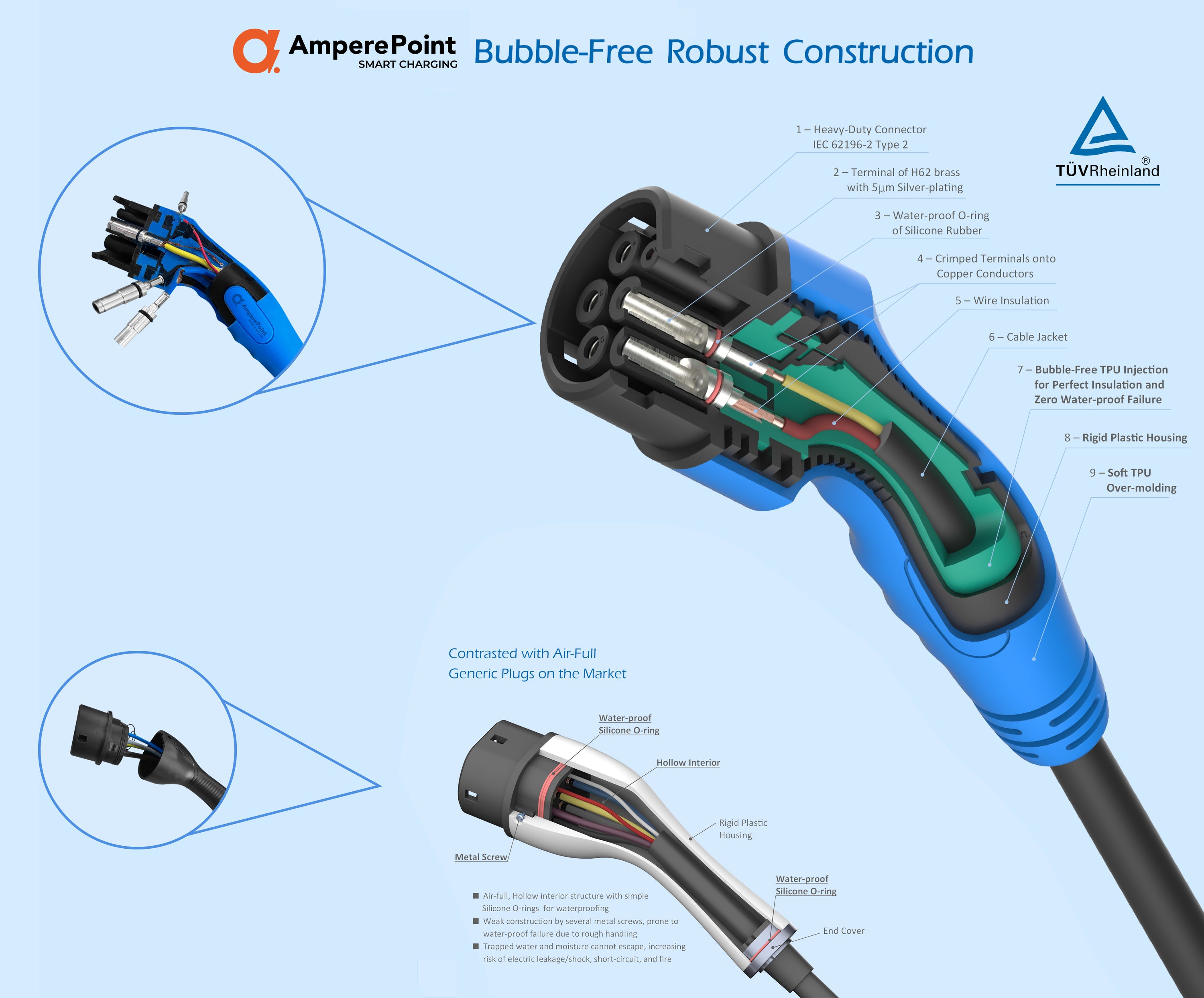 ✓ Blasenfreie TPU-Injektion – Innenraum vollständig mit TPU gefüllt, keine Hohlräume oder Luftblasen ✓ TÜV Rheinland Zertifiziert – Sicherheit durch unabhängige Prüfung bestätigt (nicht jedes Kabel hat dies) ✓ Über 10.000 Zyklen Lebensdauer – dokumentierte Haltbarkeit, ein Kabel, das jahrelang hält✓ Kompatibel mit allen Elektro- & Hybridfahrzeugen (Standard Typ 2 Stecker)