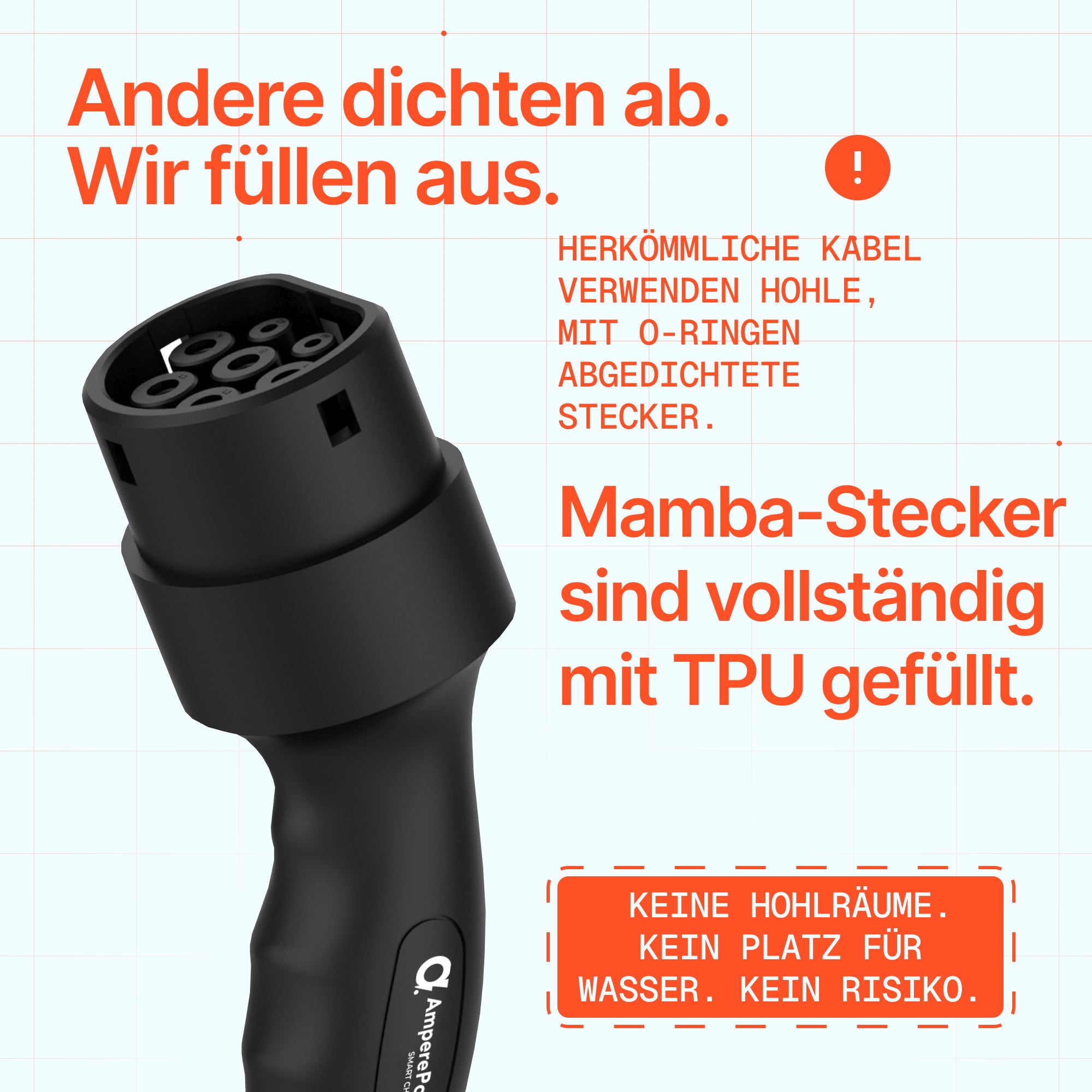 Das Innere des Steckers ist vollständig mit TPU ohne Luftblasen gefüllt. Die Konkurrenz hat hohle Innenräume, die nur mit O-Ringen abgedichtet sind. Mamba ist gefüllt – kein Risiko des Wassereintritts.