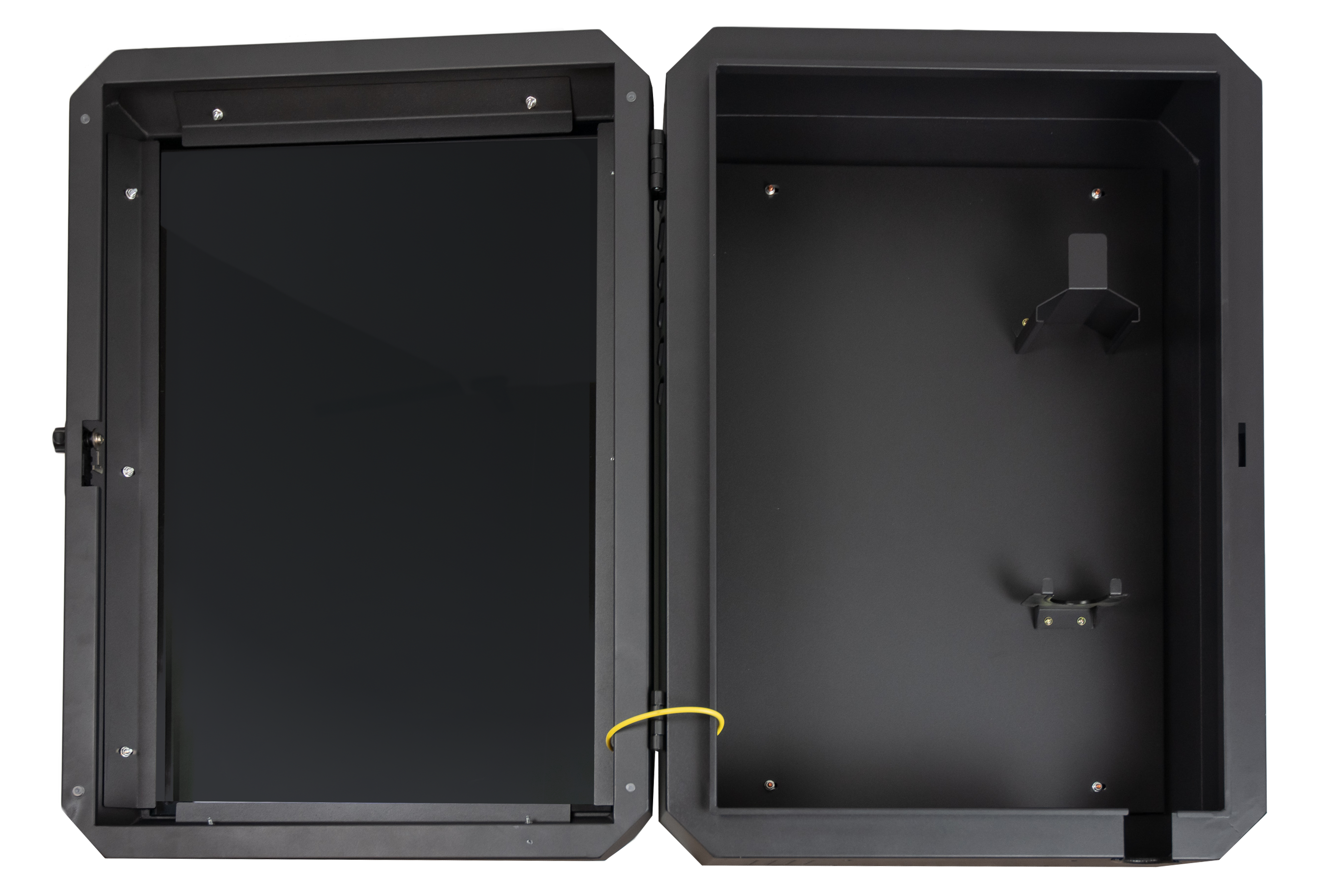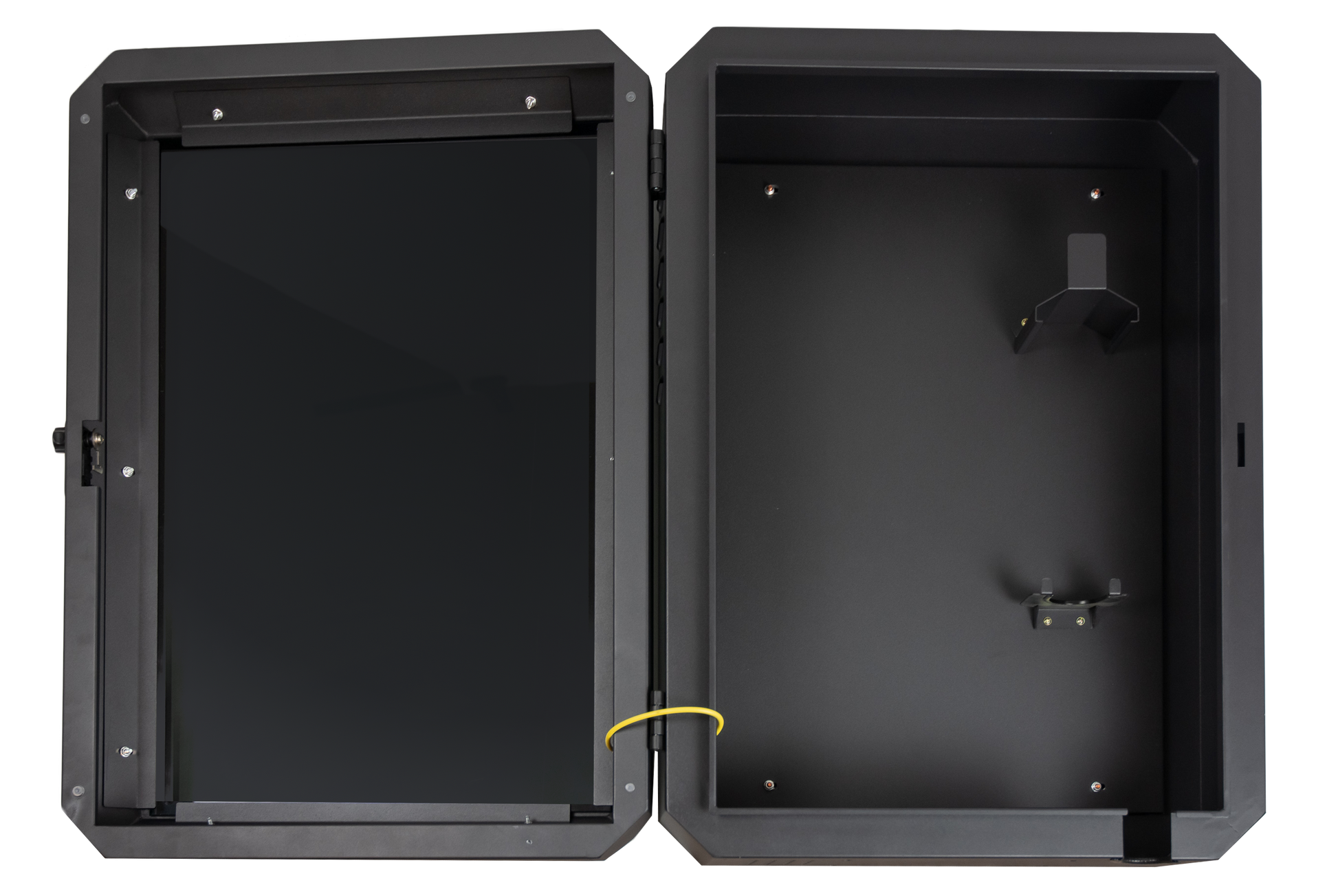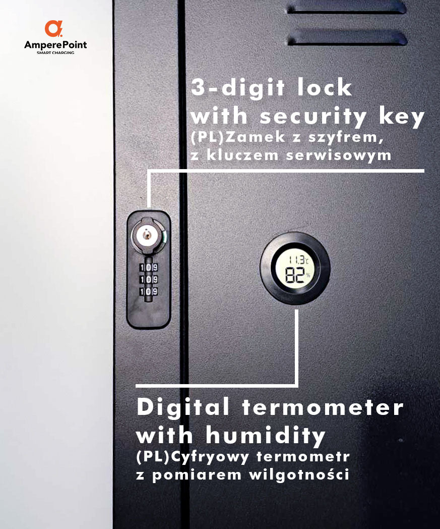 Schützen Sie Ihr Ladegerät vor unbefugtem Zugriff und widrigen Wetterbedingungen. Robuster Schrank mit Temperaturregelung, einem Zahlenschloss mit Schlüssel (neue Version 2024), Belüftungsöffnungen und funktionalen Kabeldurchführungen.