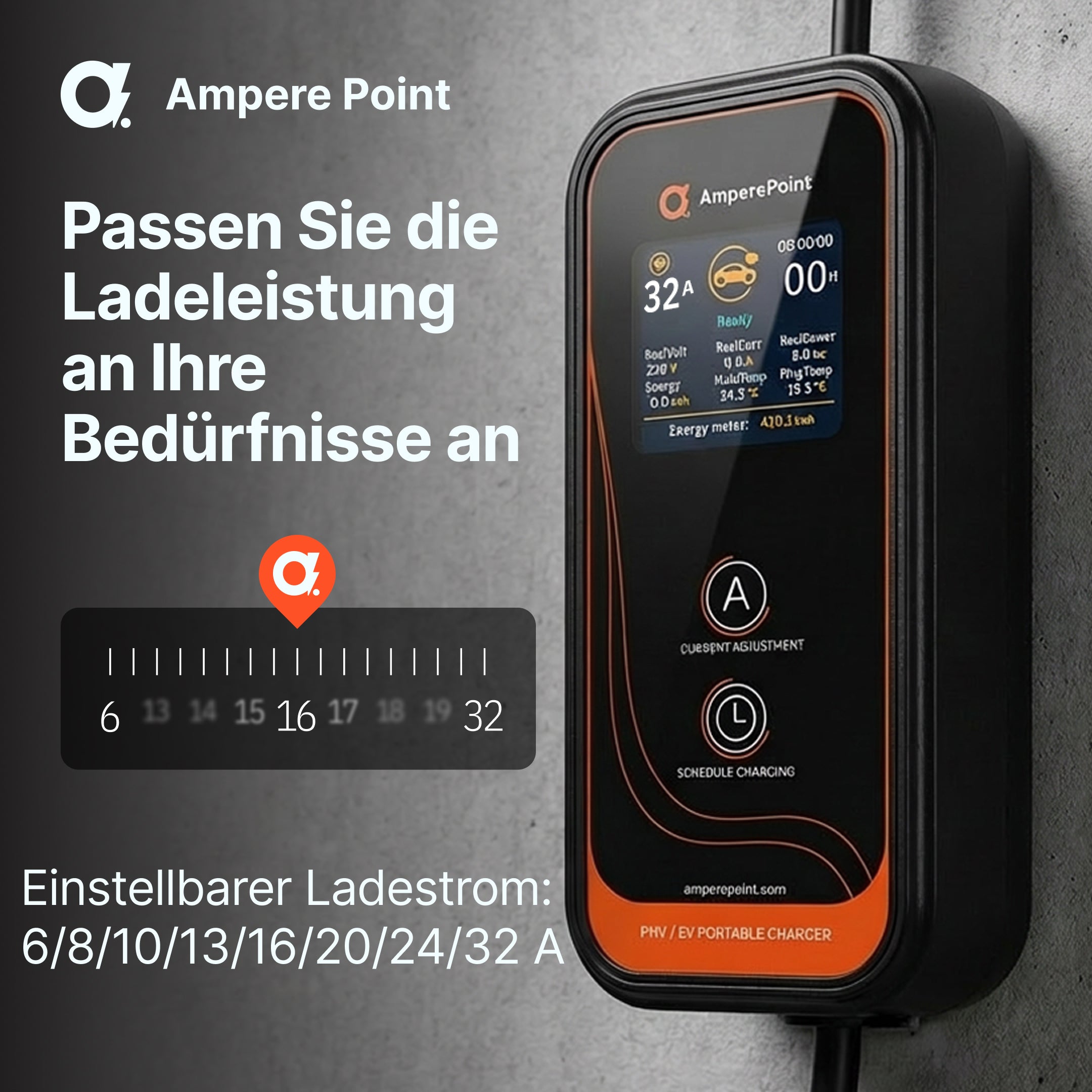 Einstellbare Ladeleistung (A: 8/16/20/24/32) und eine Zeitplanoption zur Optimierung des Energieverbrauchs während der Nebenzeiten.